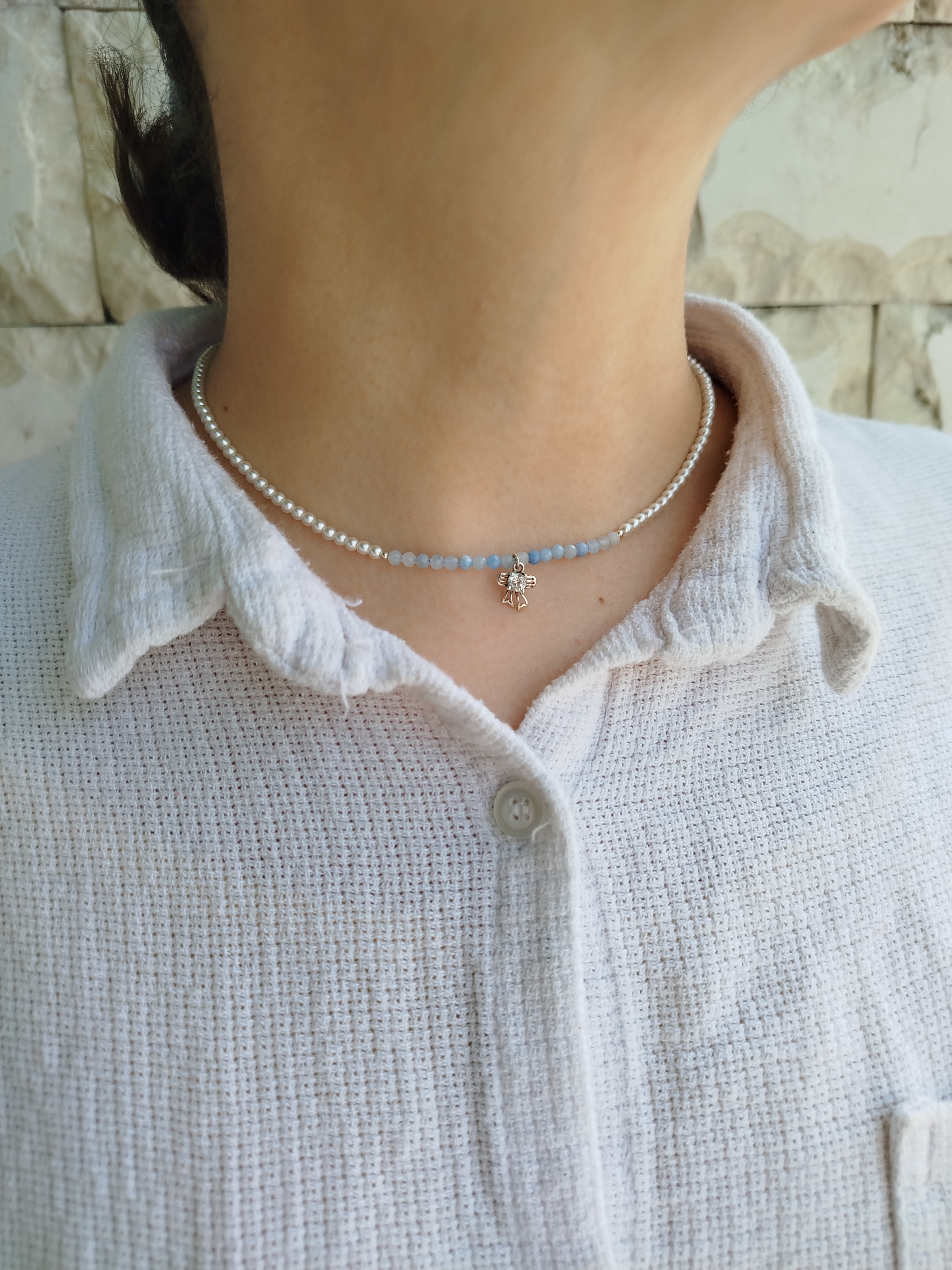 گردنبند پلاک نقره و سنگ آکوامارین و شل